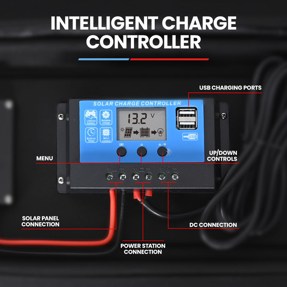 The monocrystalline solar cells are dustproof and splashproof, designed for durability and high efficiency. They include an intelligent built-in charge controller that allows you to optimize power transfer to deep cycle, AGM, lead-acid batteries, and most lithium power stations. It also features two USB-A ports (5V, 2.0A) for charging your devices directly without draining your power station or battery.