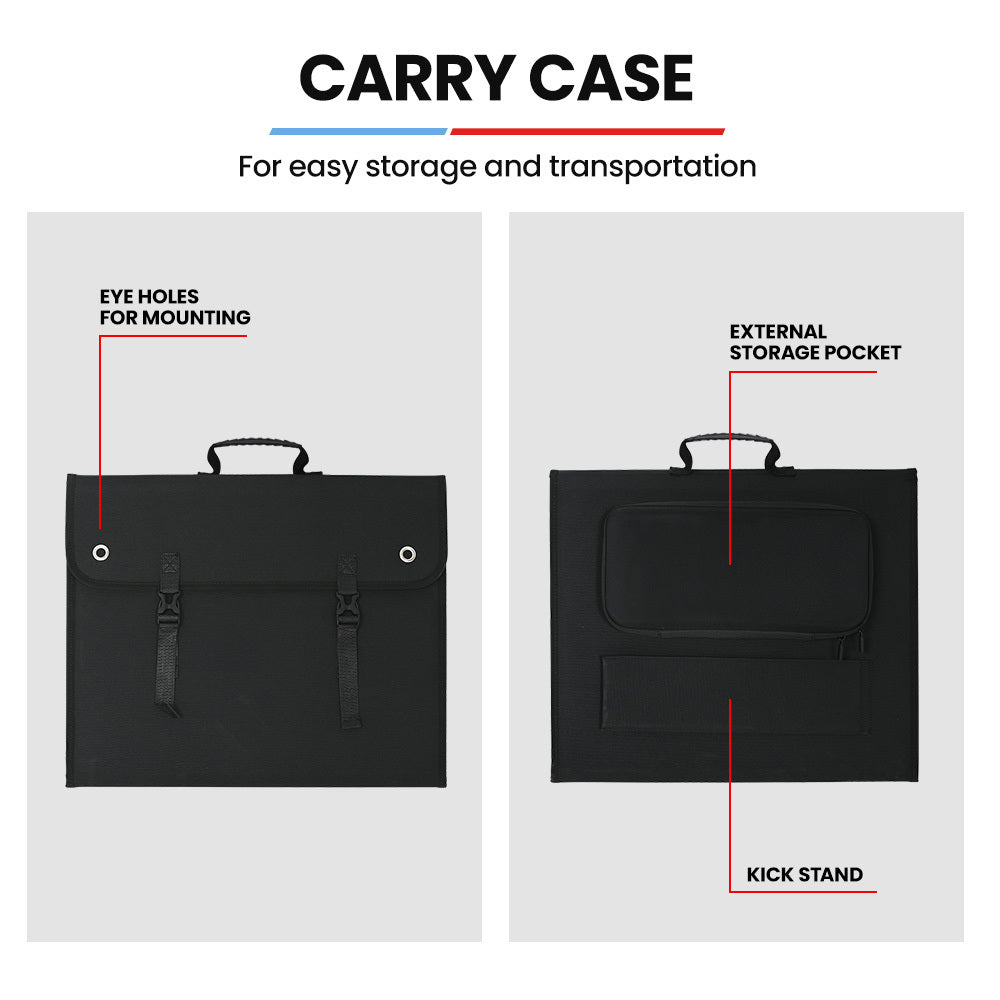 Two adjustable kickstands provide optimal positioning for sunlight absorption, allowing the panels to capture 25-30% more energy throughout the day. The lightweight design, weighing just 5kg, and included carry case with an ergonomic handle make it easy to transport and store. The panels fold flat and include reinforced grommets for hanging on your tent, backpack, or vehicle for easy access to power.