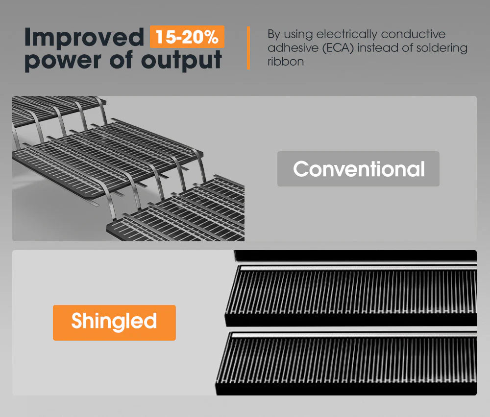 - Shingled Cell Technology: Eliminates the need for busbars, ribbons, and soldered joints found in conventional panels, reducing potential failures.