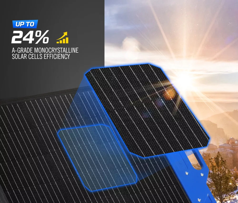 - High Energy Efficiency: A-grade monocrystalline solar cells achieve 24% conversion efficiency for rapid charging