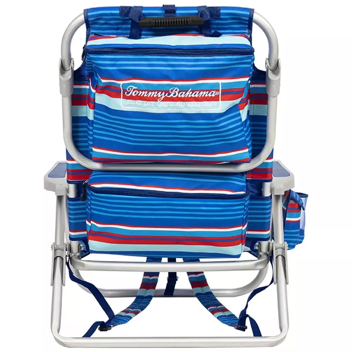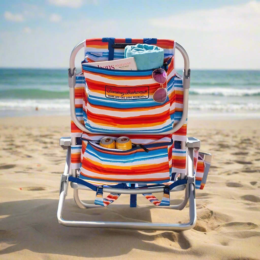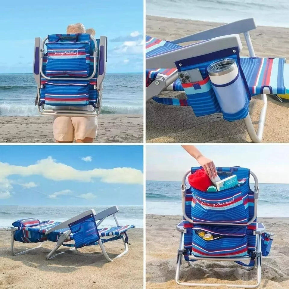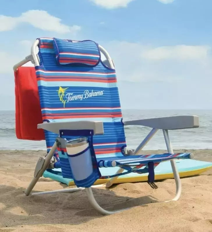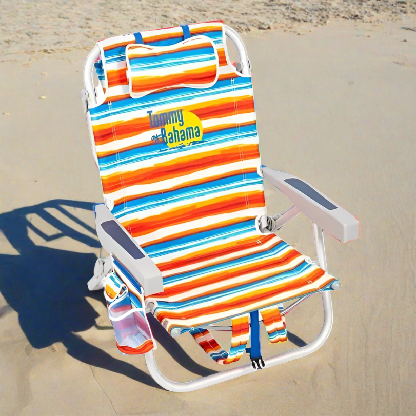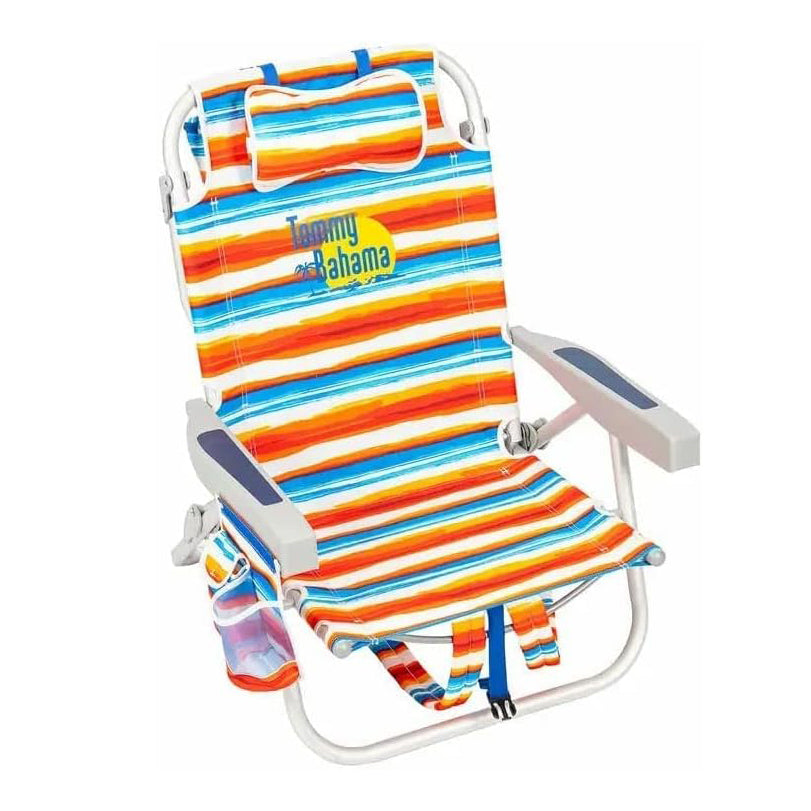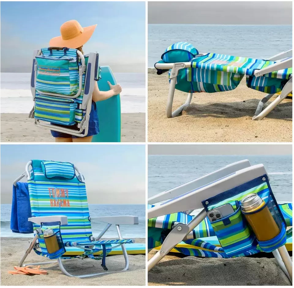 The chair has a lightweight, rust-resistant aluminium frame and it collapses into a transportable backpack for hands-free toting. When unfolded, the chair can recline into five different positions for ultimate comfort while soaking up the rays.