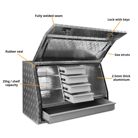 This aluminium ute tool chest is an ideal to store your tradie tools and equipment. Large capacity, secure and moisture resistant suitable for fitment to utes, table tops, vans, trucks and trailers. It can also be used for your camping or touring gear.