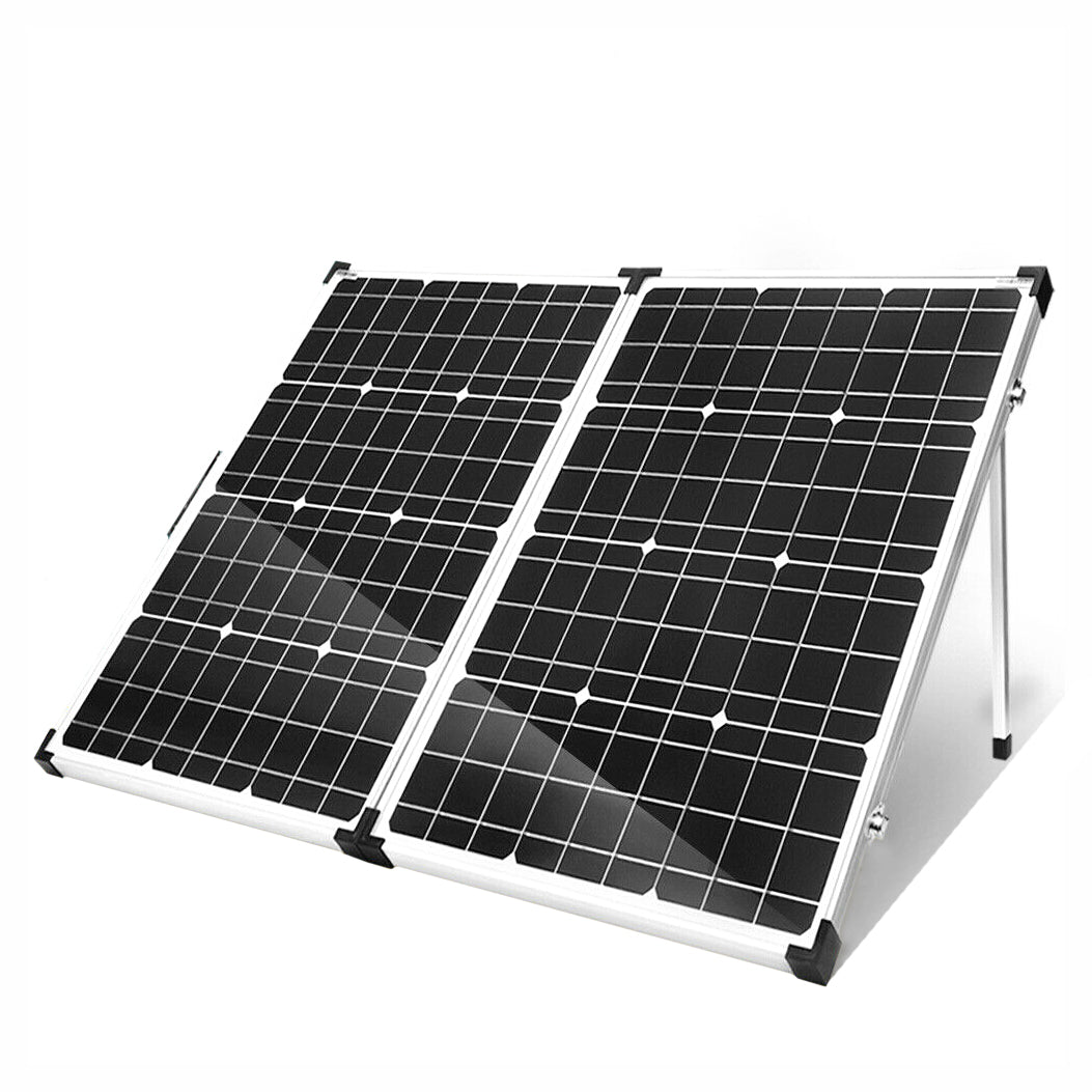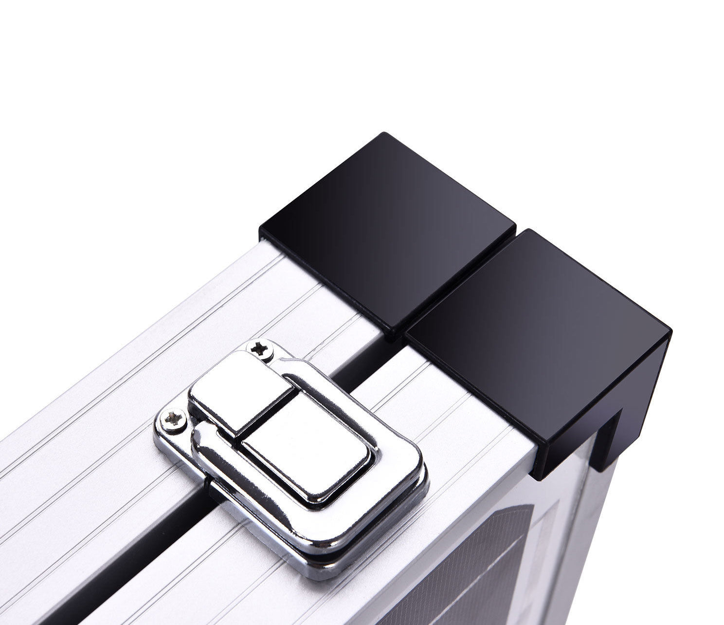 This folding solar panel kit comes with a connection cable, aluminium fold-out legs, heavy-duty steel fasteners, a solar regulator and alligator clips. You will only need your own 12V battery, then you have everything you need to keep charged when you are camping or off-grid.