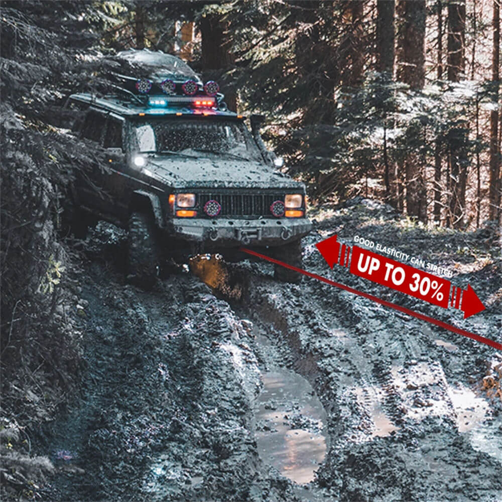 Ductility and Durability: With a maximum stretch of 30-35%, this elastic rope breaks mud suction and reduces impact loads on the vehicle. Its dynamic nature effectively stores energy, while the robust material coating and reinforced eye ring connecting fixed points ensure exceptional wear resistance, extending the service life by at least 50%.