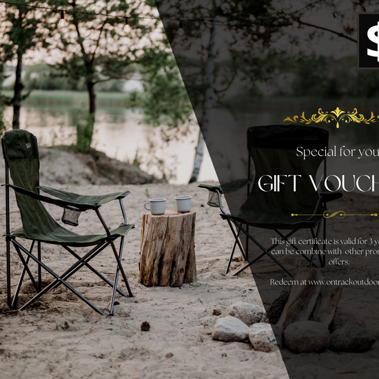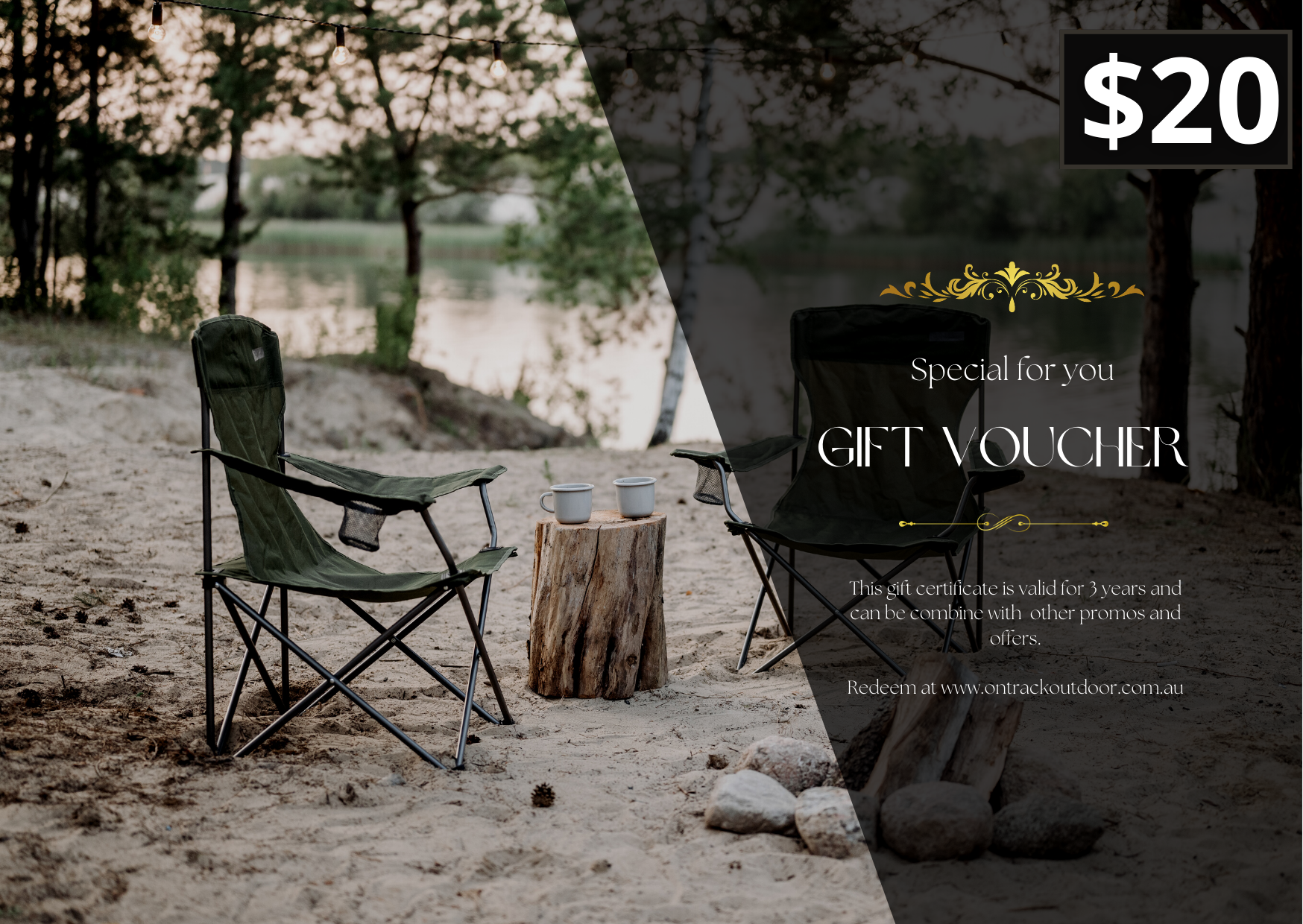 Shout them an OnTrack Outdoor e-Gift Voucher. Take the hassle out of choosing the perfect pressie. Let them choose from our huge range of 4x4, caravanning, camping, hiking and outdoor gear! Our E-Gift vouchers are available in $20, $50, $100, $120, $150, $200, and $500 values and are valid for 3 years from purchase.
