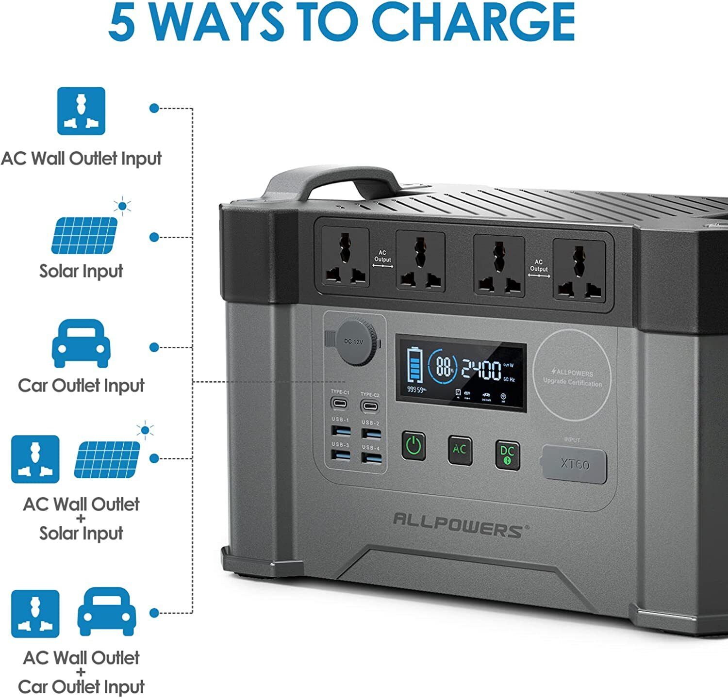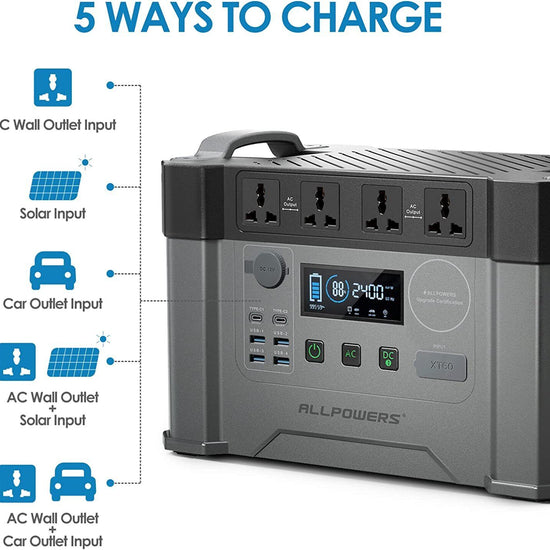 - 5 ways to charge the unit: solar, AC adapter, car charger, AC + solar, AC + car charger