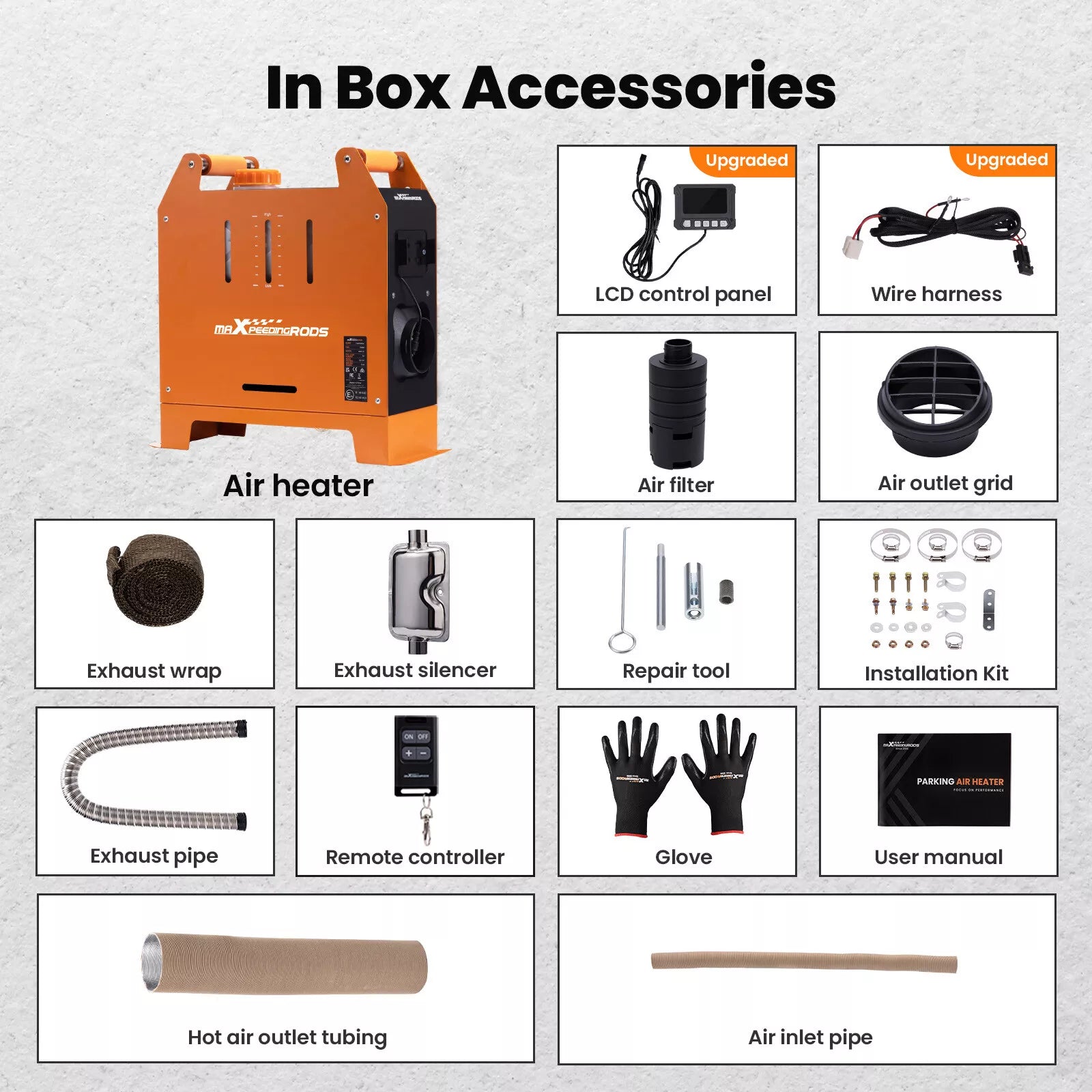 The exhaust pipe of this upgraded air heater has been reinforced for added durability and is supported by an air exhaust muffler that ensures quiet operation. In addition, the package comes with a set of free gloves and a repair tool, adding extra value to your purchase.