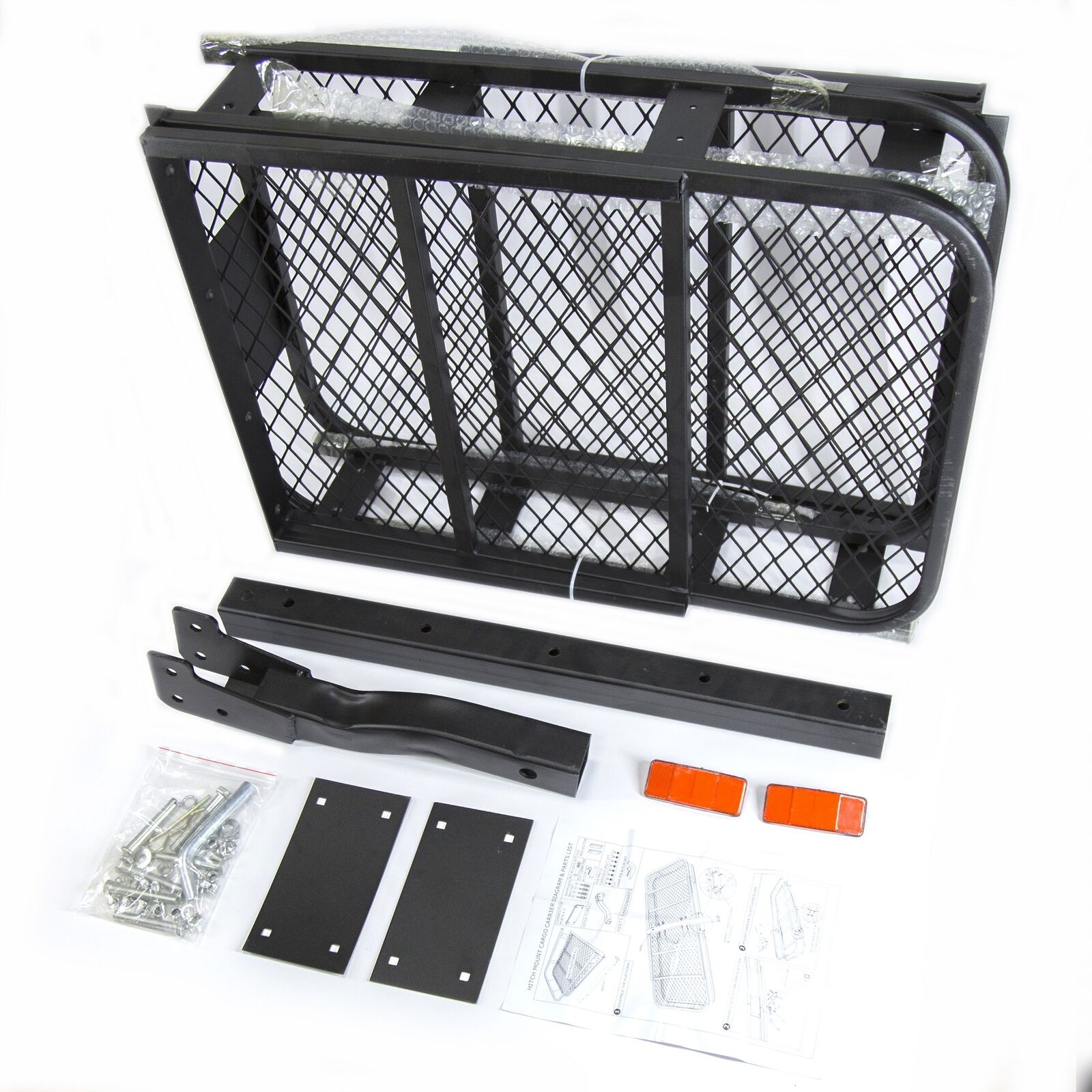Carry all your essential gear with ease using this heavy-duty rear cargo basket. Built from durable powder-coated steel, it can handle loads up to 225 kg and is designed to withstand the elements. When not in use, fold it up to save space. Perfect for road trips, camping, and freeing up space inside your vehicle.