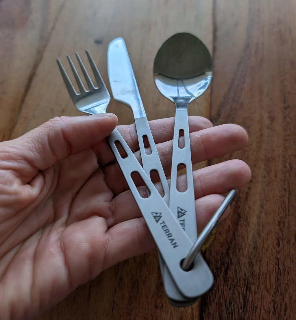 - 3-piece titanium cutlery set: knife, fork, spoon